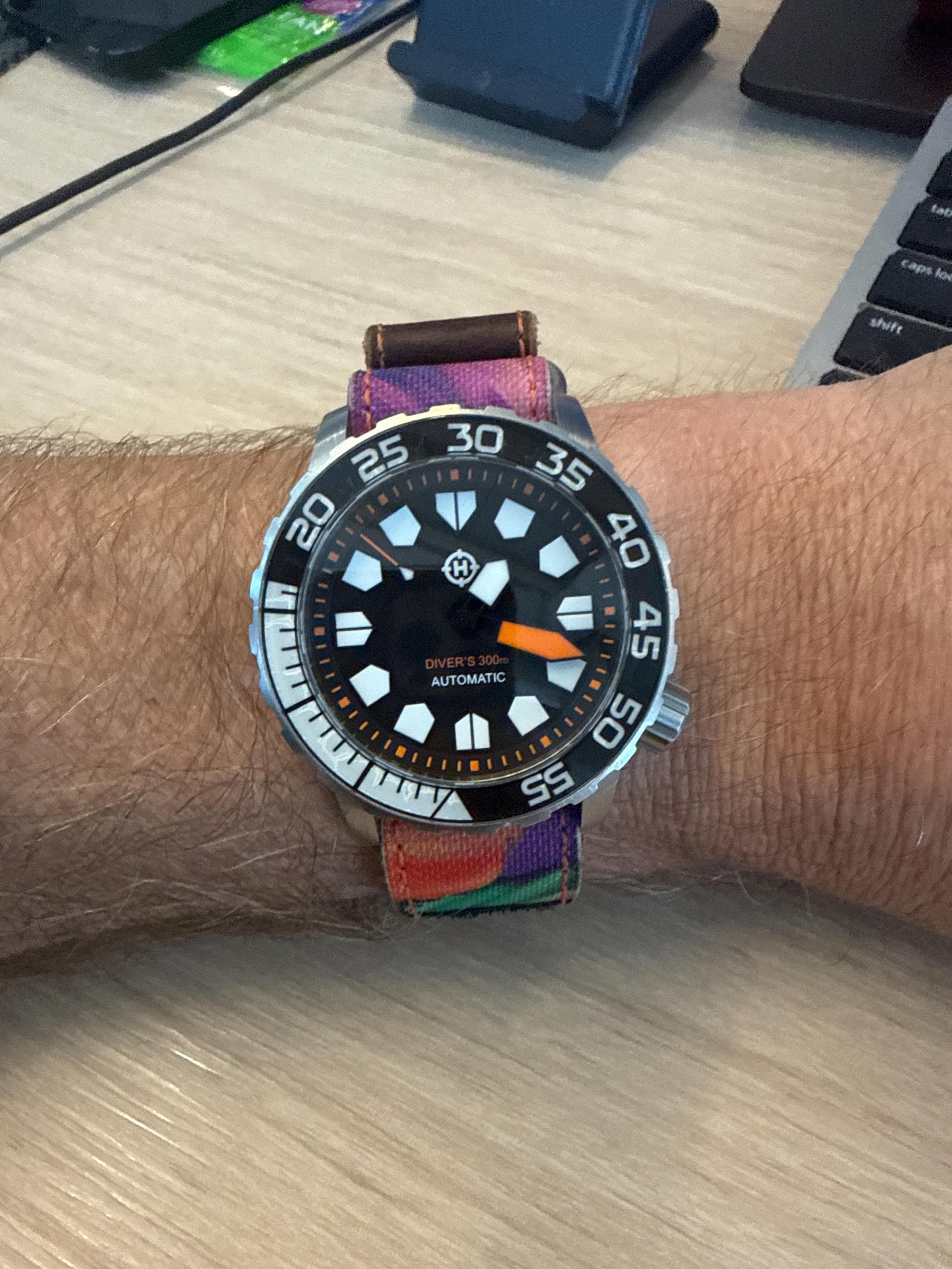 Rugged nylon floral fully laminated and stitched to a premium, US tanned leather underside. Available in 20mm and 22mm widths with your choice of matte stainless or black PVD hardware.