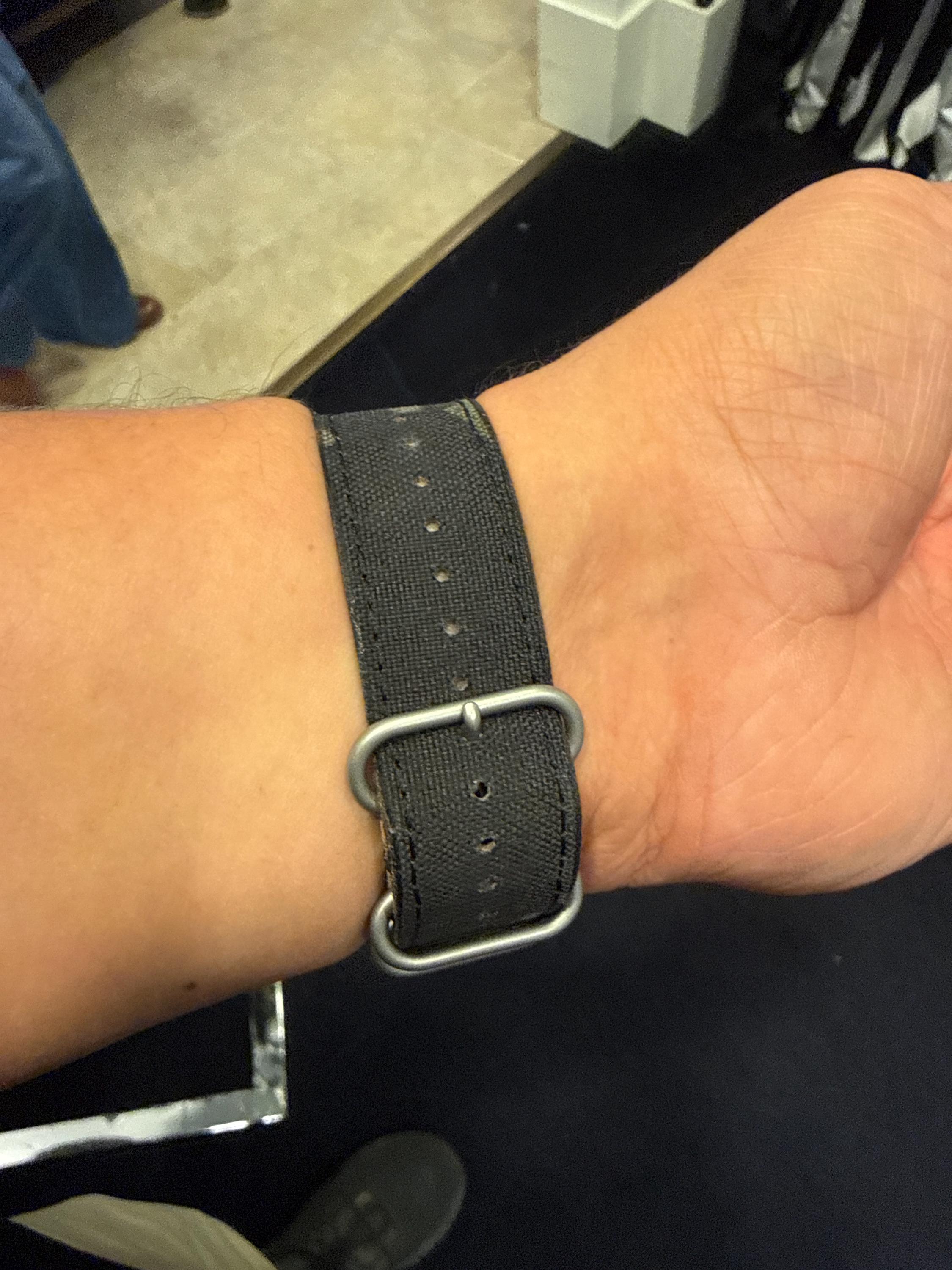 500d Multicam Black Cordura fully laminated and stitched to a premium US tanned leather underside. Available in 20mm and 22mm widths with your choice of matte stainless or black PVD hardware.